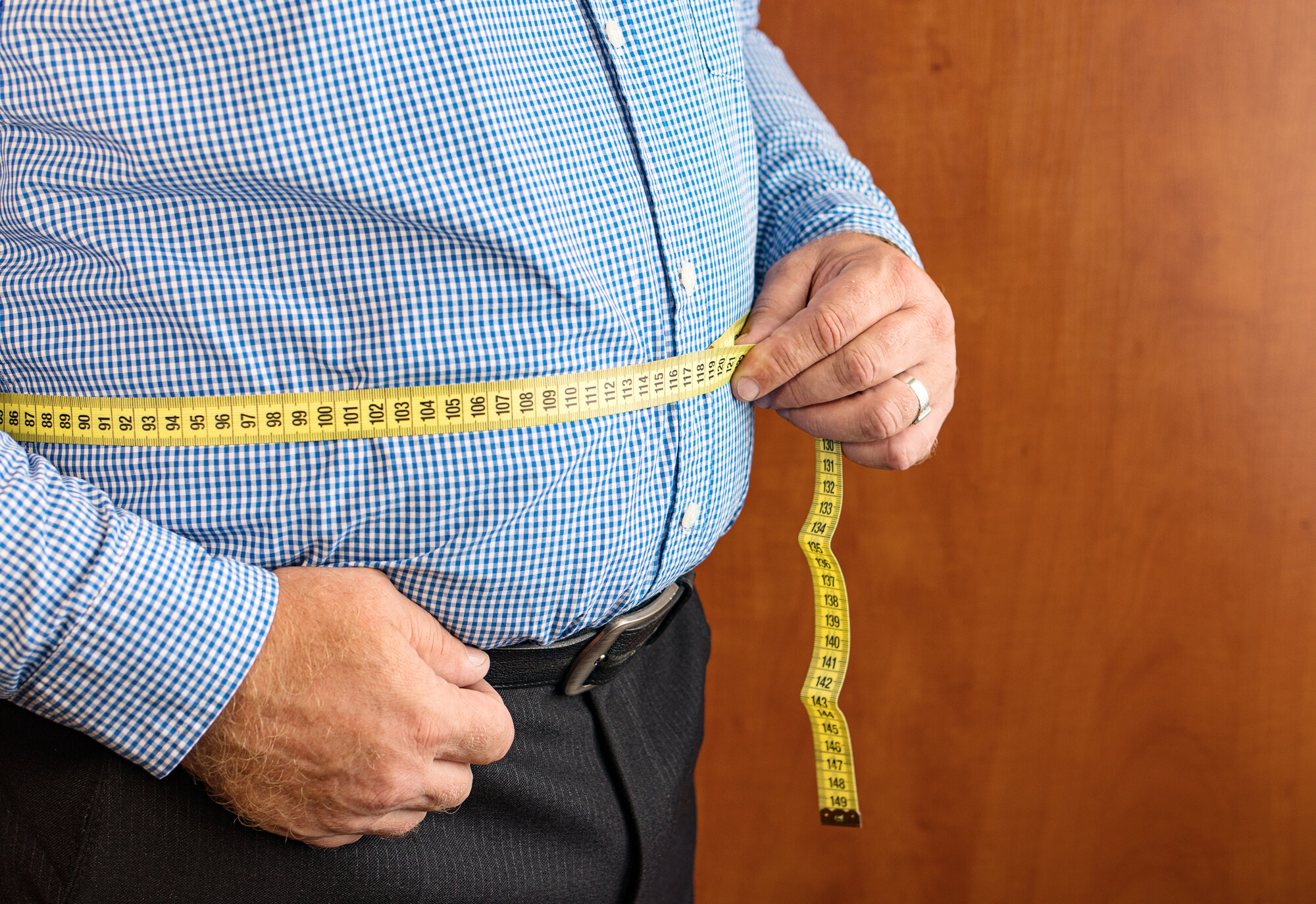 Mann misst seinen Bauchumfang mit einem gelben Maßband, trägt ein kariertes Hemd und dunkle Hose.