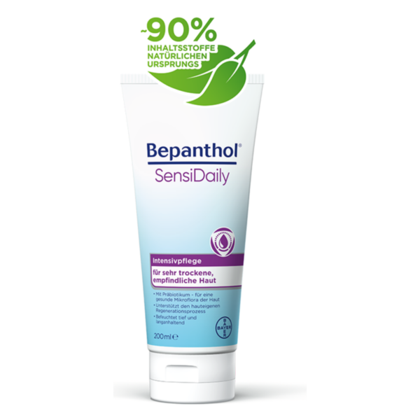 Bepanthol® SensiDaliy ist die ideale Pflege für Menschen mit sehr trockener, empfindlicher oder zu Neurodermitis und Juckreiz neigender Haut. Sie besitzt zudem einen hautfreundlichen pH Wert (5,5) und enthält ca. 90% Inhaltsstoffe natürlichen Ursprungs.