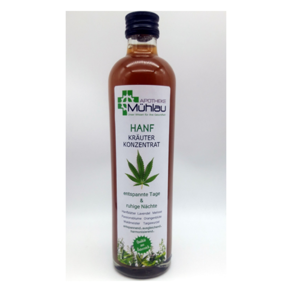 Inhaltsstoffe: Wasser, Vitamin C, Pektin, Hanf-, Melissenblätter, Passionsblume, Orangenblüte, Waldmeister, Lavendel, Taigawurzel.