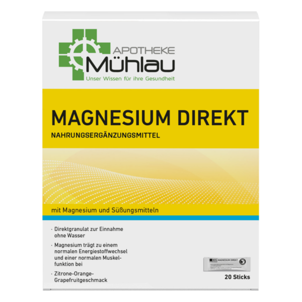 Magnesium Direkt Sticks sind ein Nahrungsergänzungsmittel mit Magnesium zur Unterstützung einer normalen Muskel-Funktion. Die Sticks sind direkt, einfach und lecker in der Anwendung. Durch die orale Einnahme ohne Wasser sind sie überall praktisch und einfach einzunehmen. 1x täglich einen Stick. Mit Zitrone-Orange-Grapefruitgeschmack.