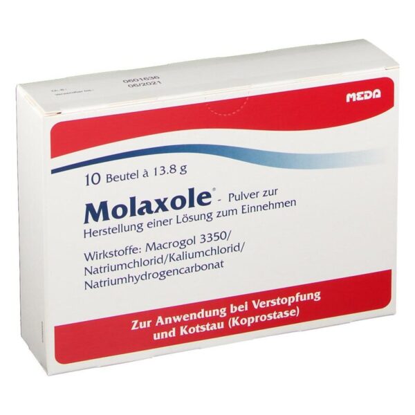 Dies bewirkt eine gesteigerte Weiterleitung des erweichten Stuhls und eine erleichterte Stuhlentleerung. Die Salze in Molaxole helfen die Salz- und Wasserbalance des Körpers zu erhalten. Wenn Sie sich nach 2 Wochen nicht besser oder gar schlechter fühlen, wenden Sie sich an Ihren Arzt.