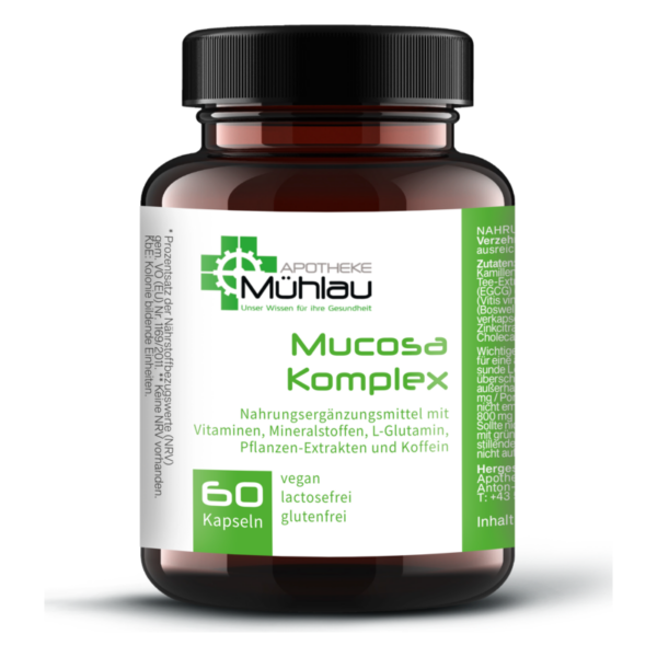 L-Glutamin, Hydroxypropylmethylcellulose (Kapselhülle), Kamillenblüten-Extrakt (Matricaria recutita), Calcium-L-ascorbat, Reismehl, Grüner Tee-Extrakt (Camellia sinensis; 50% Polyphenole, 15% Epigallocatechingallat (EGCG) und 7% Koffein), Calcium-D-pantothenat, Weintraubenkern-Extrakt (Vitis vinifera L.; 50% Oligomere Proanthocyanidine (OPC)), Weihrauch-Extrakt (Boswellia serrata; 65% Boswellinsäure), Bifidobacterium bifidum (mikroverkapselt), Lactobacillus plantarum (mikroverkapselt), Beta-Carotin, Zinkcitrat, Pyridoxinhydrochlorid, Mangangluconat, Kupfergluconat, Cholecalciferol, Natriumselenit.