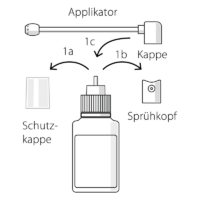 - Vor erneuter Anwendung ein- bis zweimal mit nach unten gerichtetem Applikator ansprühen und danach die Behandlung wie beschrieben durchführen.