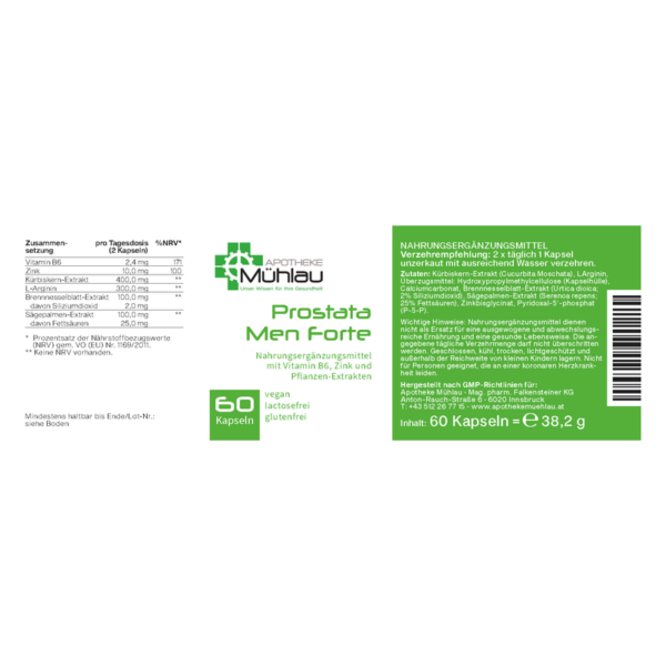 Kürbiskern-Extrakt (Cucurbita Moschata), L-Arginin, Überzugsmittel: Hydroxypropylmethylcellulose (pflanzliche Kapselhülle), Trennmittel: Calciumcarbonat, Sägepalmen-Extrakt (Serenoa repens; 25% Fettsäuren), Brennnesselblatt-Extrakt (Urtica dioica; 2% Natural Silica), Zinkbisglycinat, Pyridoxal-5‘-phosphat.