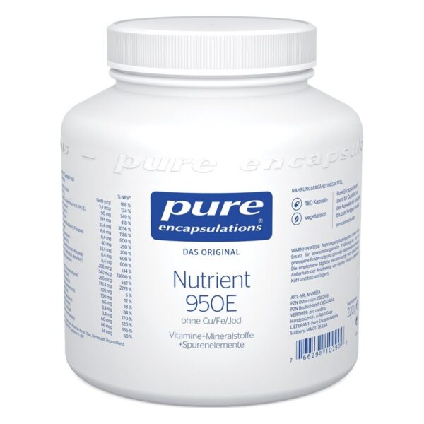 Pure Encapsulations Nutrient 950E (ohne Cu/Fe/Jod) beinhaltet ein umfangreiches Spektrum an Vitaminen und Mineralstoffen. Die Verwendung naturidenter, aktivierter Verbindungen garantiert dabei eine unvergleichbar hohe Aufnahme (Bioverfügbarkeit) der Mikronährstoffe. Die hypoallergene Formulierung gewährleistet maximale Verträglichkeit. Da die Rezeptur bewusst ohne Jod erstellt wurde, ist sie auch für Personen geeignet, die ernährungsphysiologisch auf Jod verzichten müssen.