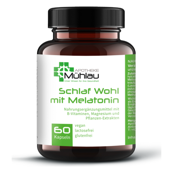 Magnesiumoxid, Überzugsmittel: Hydroxypropylmethylcellulose (pflanzliche Kapselhülle), Griffonia simplicifoliasamen-Extrakt (98% 5-Hydroxytryptophan (5-HTP)), Melissenblattpulver (Melissa officinalis L.), Passionsblumenkrautpulver (Passiflora incarnata L.), Hopfenzapfen-Extrakt (Humulus lupulus; 5% Humulon), Calcium-D-pantothenat, Pyridoxal-5‘-phosphat, Melatonin, Pteroylmonoglutaminsäure, Methylcobalamin.