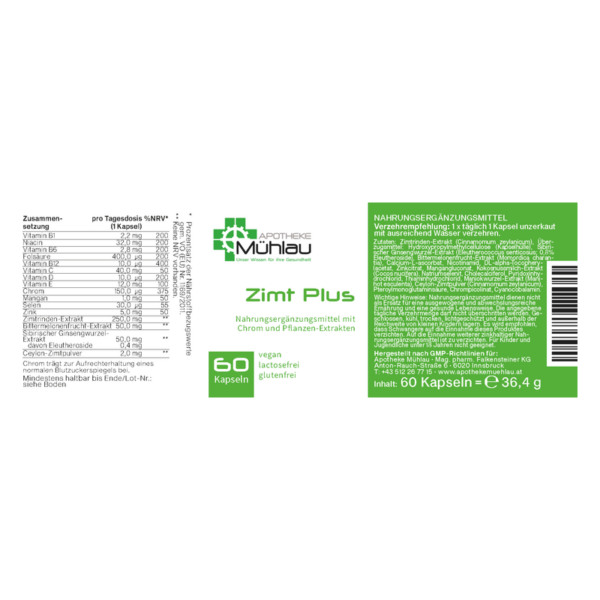 Zimtrinden-Extrakt (Cinnamomum zeylanicum), Hydroxypropylmethylcellulose (Kapselhülle), Sibirischer Ginsengwurzel-Extrakt (Eleutherococcus senticosus; 0,8% Eleutheroside), Bittermelonenfrucht-Extrakt (Momordica charantia), Calcium-L-ascorbat, DL-alpha-Tocopherylacetat, Nicotinamid, Zinkcitrat, Cyanocobalamin, Mangangluconat, Cholecalciferol, Pyridoxinhydrochlorid, Thiaminhydrochlorid, Chrompicolinat, Ceylon-Zimtpulver (Cinnamomum zeylanicum), Pteroylmonoglutaminsäure, Natriumselenit.